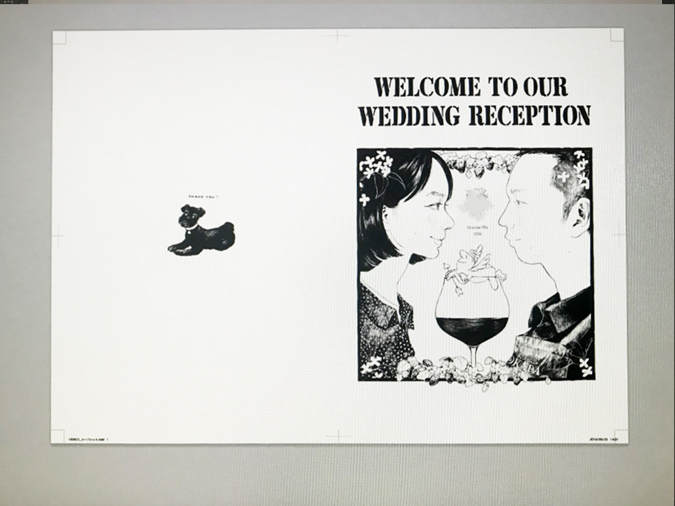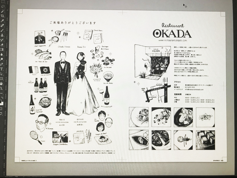 パンフレット外面 パンフレット中面 メッセージカード 友人に贈ったウェルカムボードなど。東京でレストランをしている方なので、来場の方向けにお店の紹介もしちゃいました。綺麗に撮影して作品ページ作りたいな。